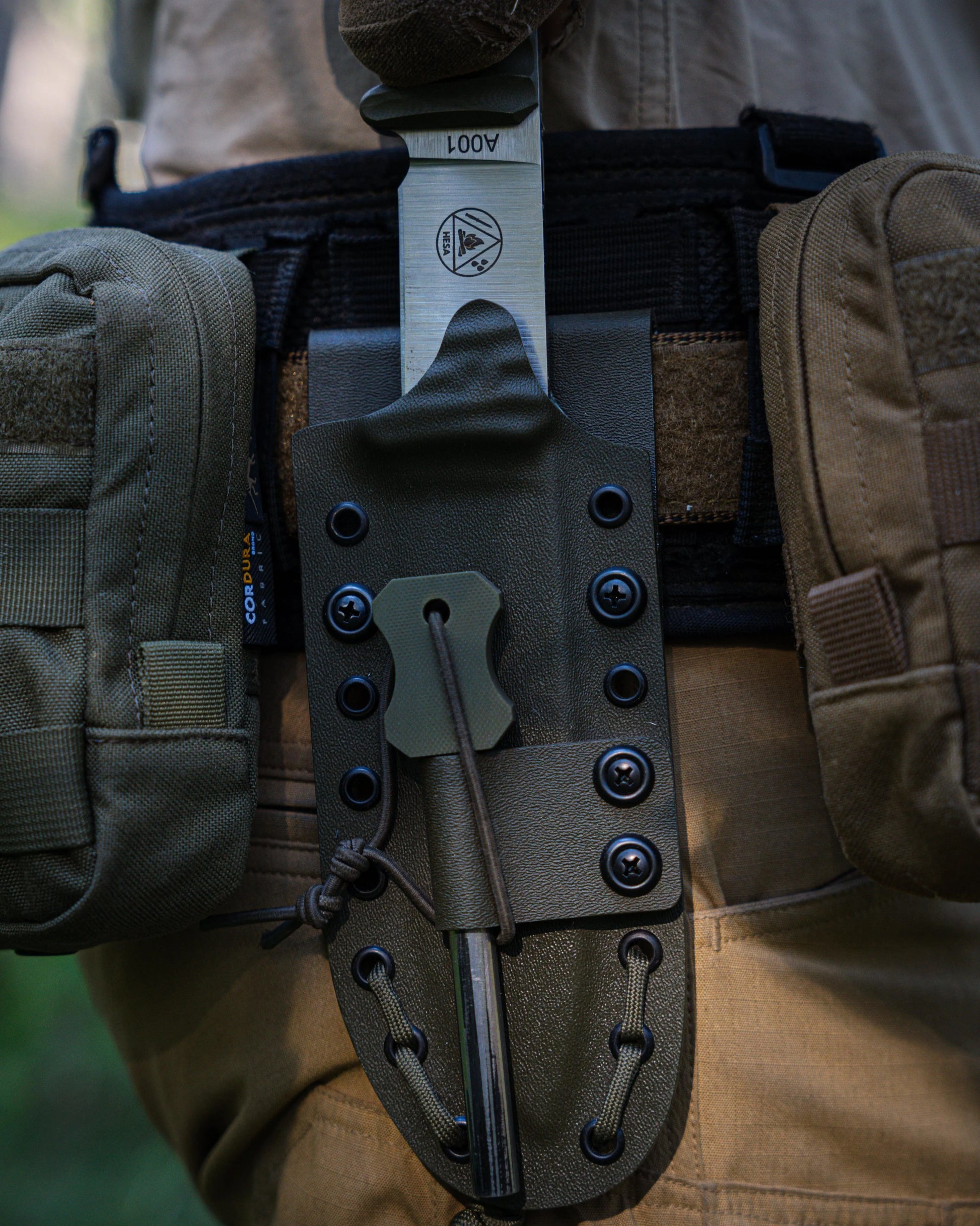 Geliefert wird dein HESA Arbeitsmesser in einer speziell an das Messer angepassten, hochwertigen Kydexscheide mit Gurtmontage und einem großen Feuerstahl.